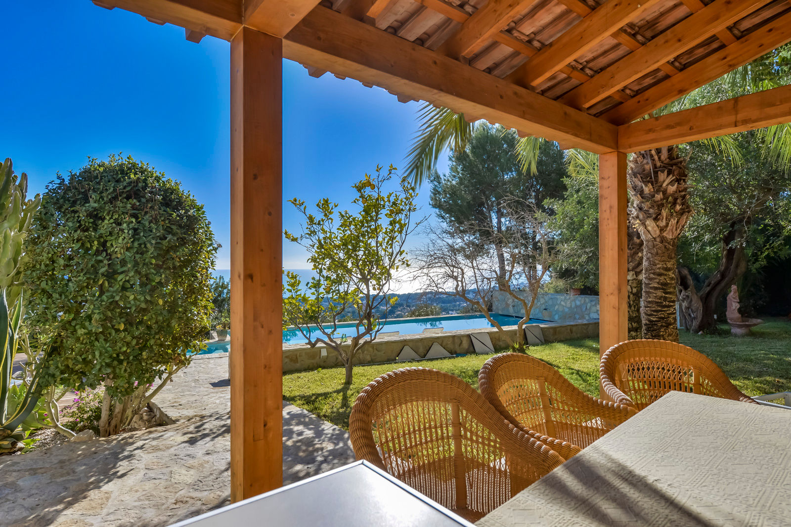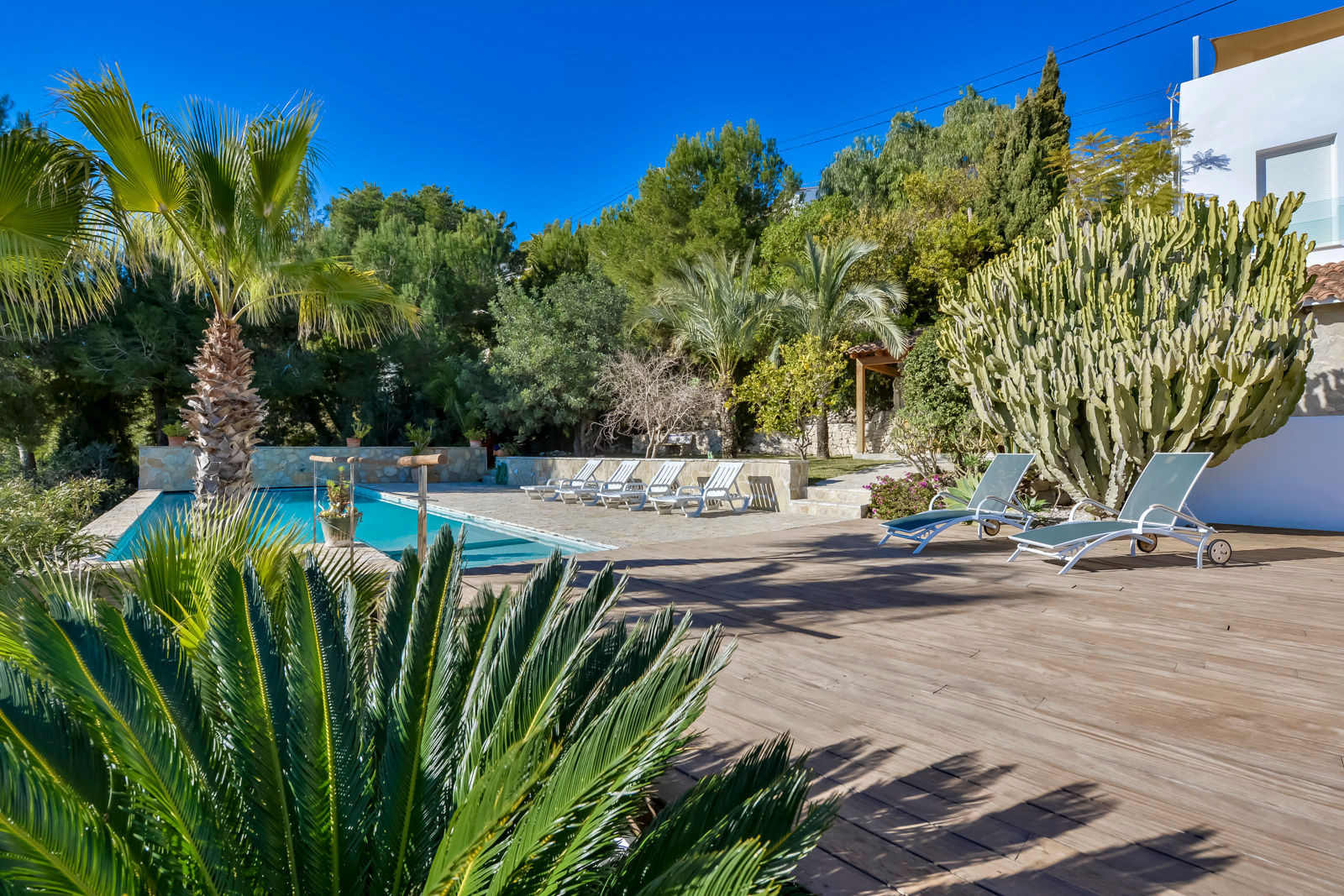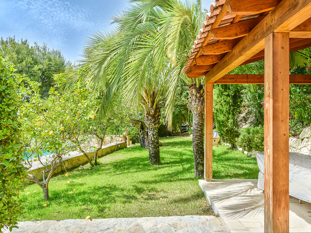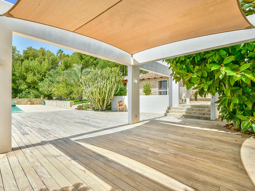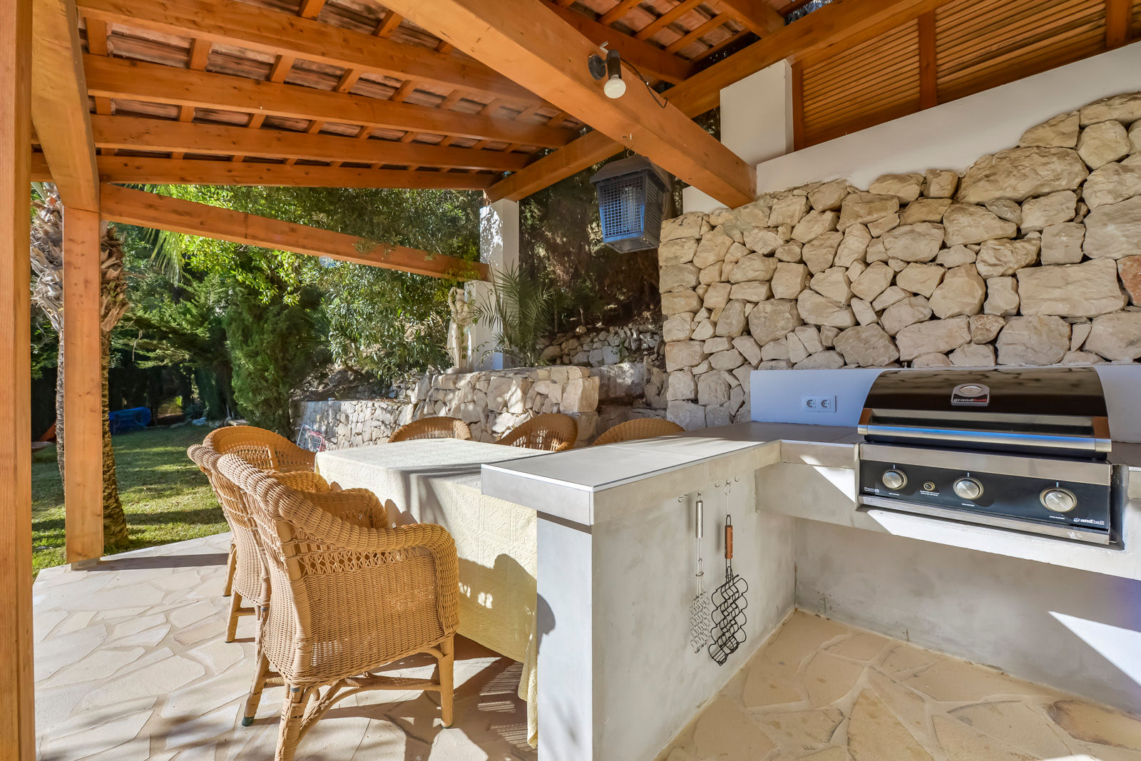 Der Außenbereich (1.600 m2) bietet viel Privatsphäre, einen wunderschönen Garten mit Palmen, Rasen, Obstbäumen, einen großen Pool mit wunderschönem Blick auf die Meeresbucht, das Meer und Moraira. Ein BBQ-Bereich mit Außenküche und Sitzgruppe und eine Außendusche mit WC runden das Exterieur ab.