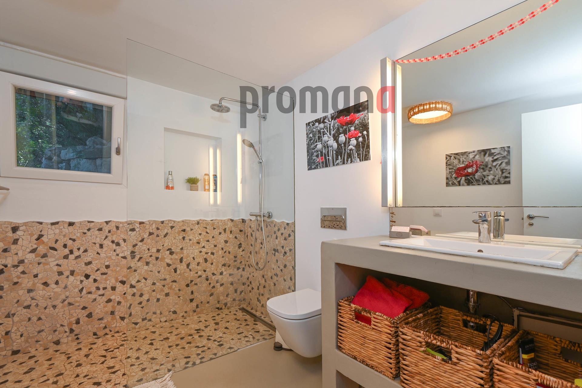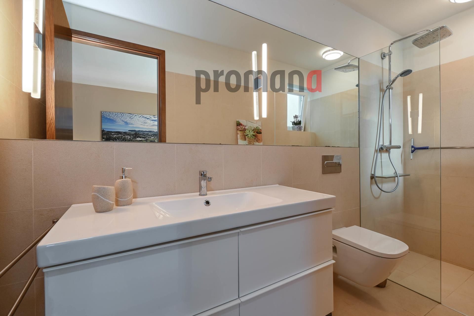 Die Villa bietet insgesamt 3 Schlafzimmer und 3 Badezimmer, verteilt auf 2 Wohneinheiten. Vom Carport führt eine Treppe und auch ein Fahrstuhl hinunter zur Poolebene.