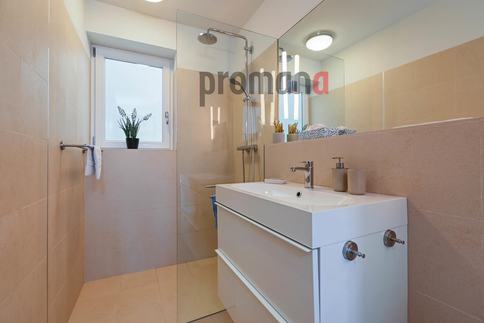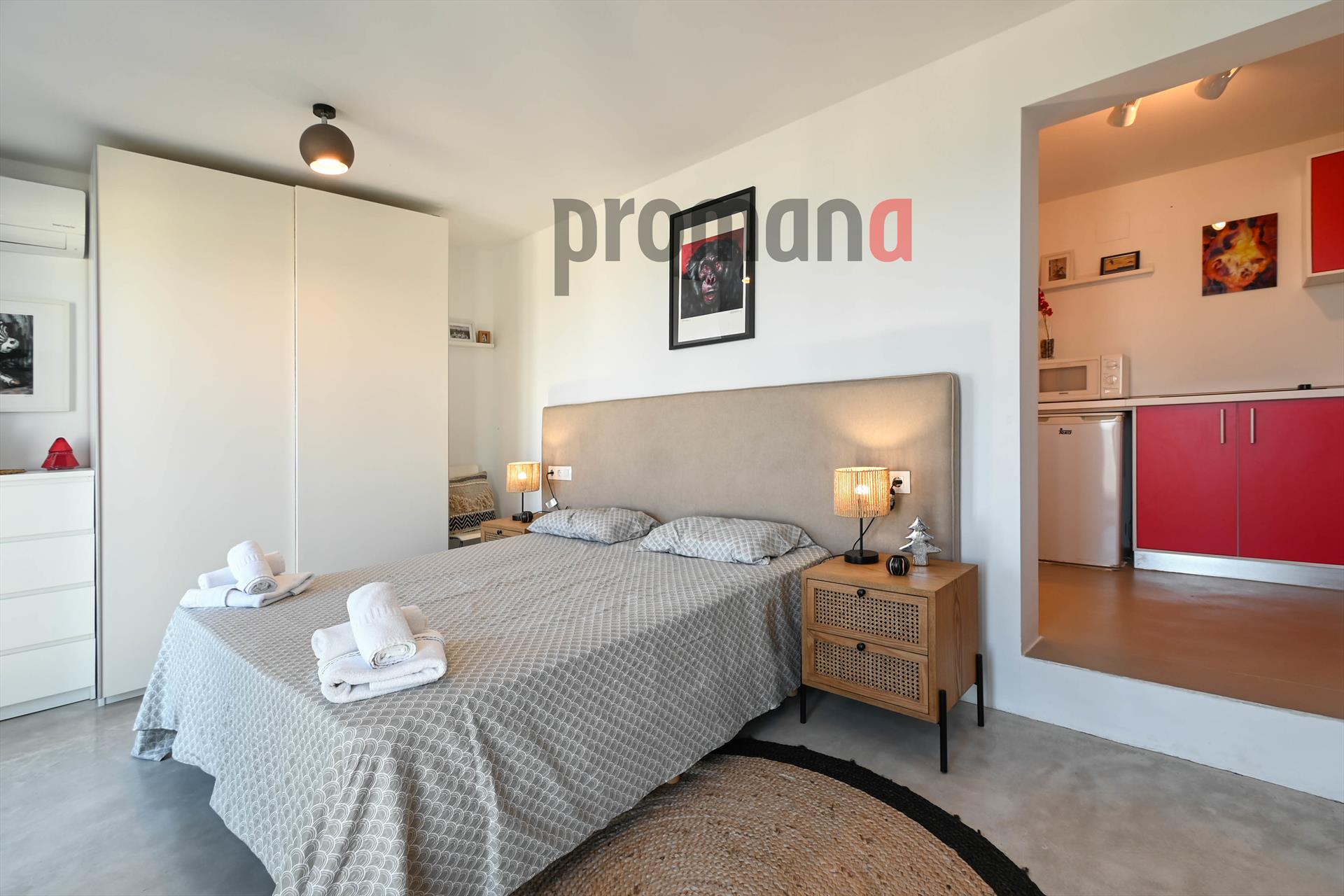 Obere Etage des Haupthauses: Zwei Doppel- Schlafzimmer eines davon mit en Suite Badezimmer, ein weiteres Badezimmer mit Waschmaschine und Trockner, ein helles freundliches Wohn-Esszimmer mit 50“ SAT-TV, vollausgestatteter Einbauküche und Zugang zur weitläufigen Terrasse mit Meerblick.